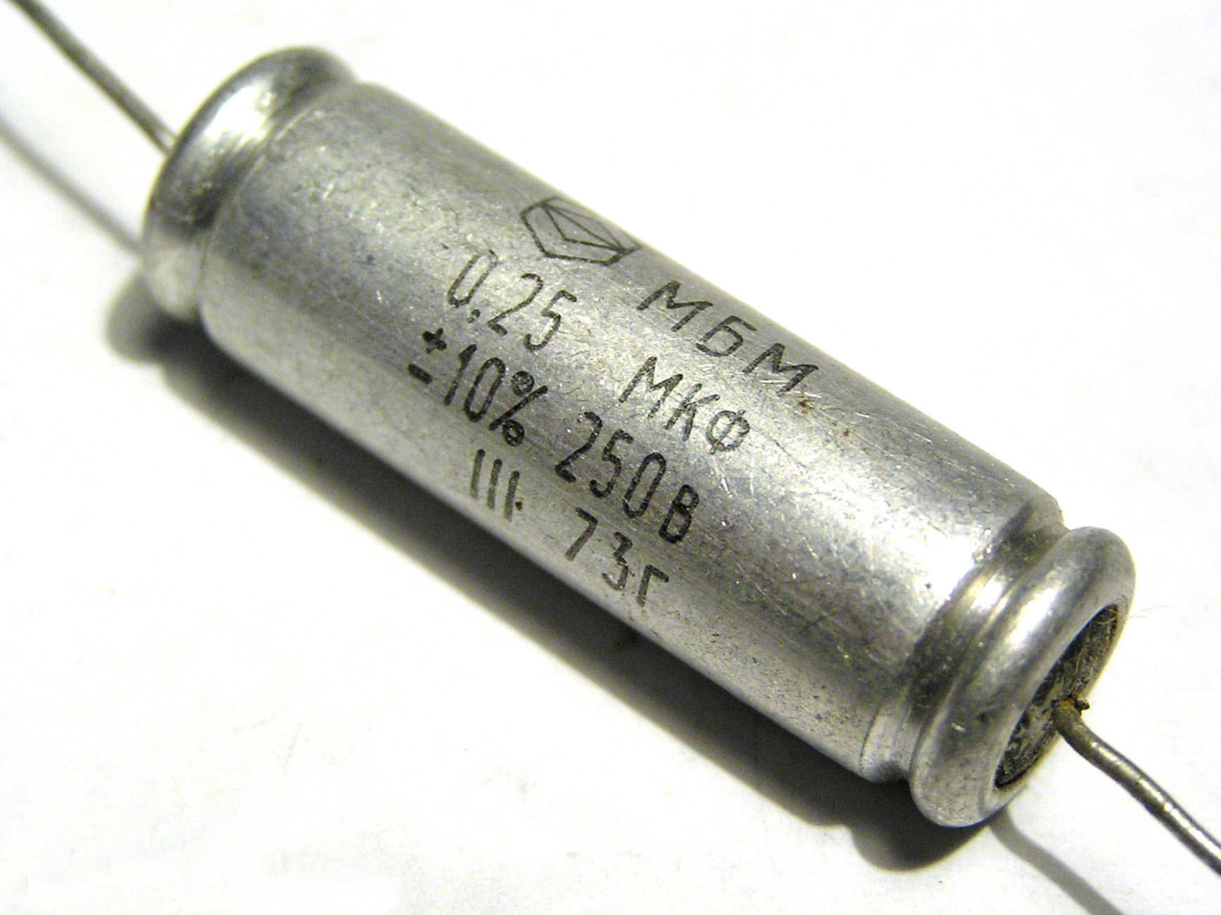 МБМ 250В 0.25 мкф конденсатор металлизированный бумажный малогабаритный постоянной ёмкости в алюминиевом уплотненном цилиндрическом корпусе,предназначен для эксплуатации в цепях постоянного переменного и пульсирующего тока.Конденсатор относится к разделу пассивных электронных компонентов. По конструкции состоит из двух электродов в форме пластин (называемых обкладками), разделённых диэлектриком, толщина которого мала по сравнению с размерами обкладок.
