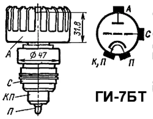 Импульсный генераторный триод ГИ-7БТ для генерирования и усиления высокочастотных колебаний дециметрового диапазона в непрерывном режиме работы и в импульсном при анодной модуляции.