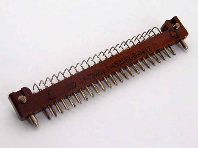 ГРПМ1У-45ШУ2В вилка прямоугольная предназначена для работы в электрических цепях постоянного, переменного, импульсного токов, обеспечивает соединение печатных плат, хвостовики для углового монтажа в отверстие печатной платы.